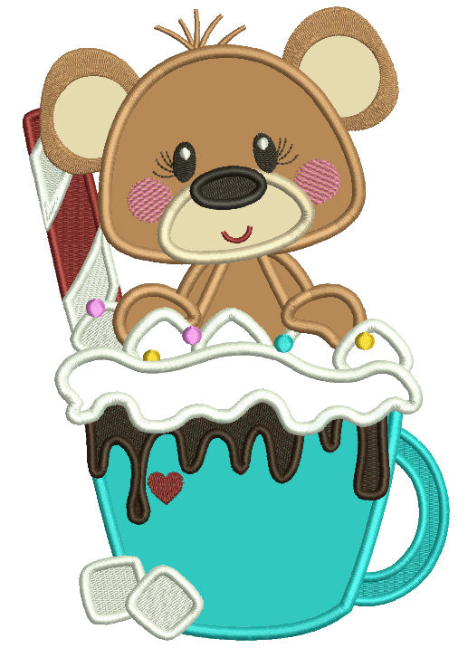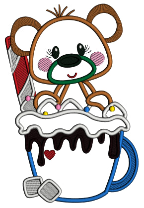 Bear Sitting Inside a Cup With Chocolate And Marshmallow Christmas Applique Machine Embroidery Design Digitized Pattern