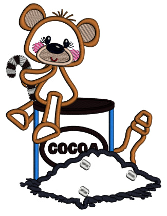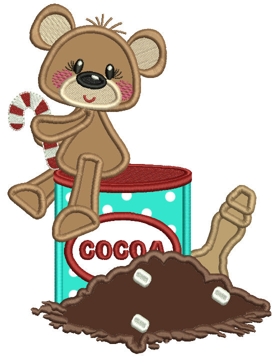 Bear Sitting On The Cocoa Holding Candy Cane Christmas Applique Machine Embroidery Design Digitized Pattern