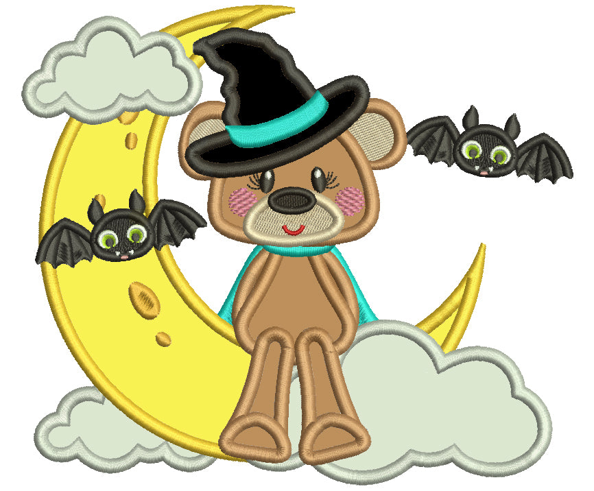 Bear Wearing Witch Hat SItting On The Moon Halloween Applique Machine Embroidery Design Digitized Pattern