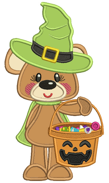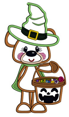Bear Wearing Witch Hat Trick Or Treating Halloween Applique Machine Embroidery Design Digitized Pattern
