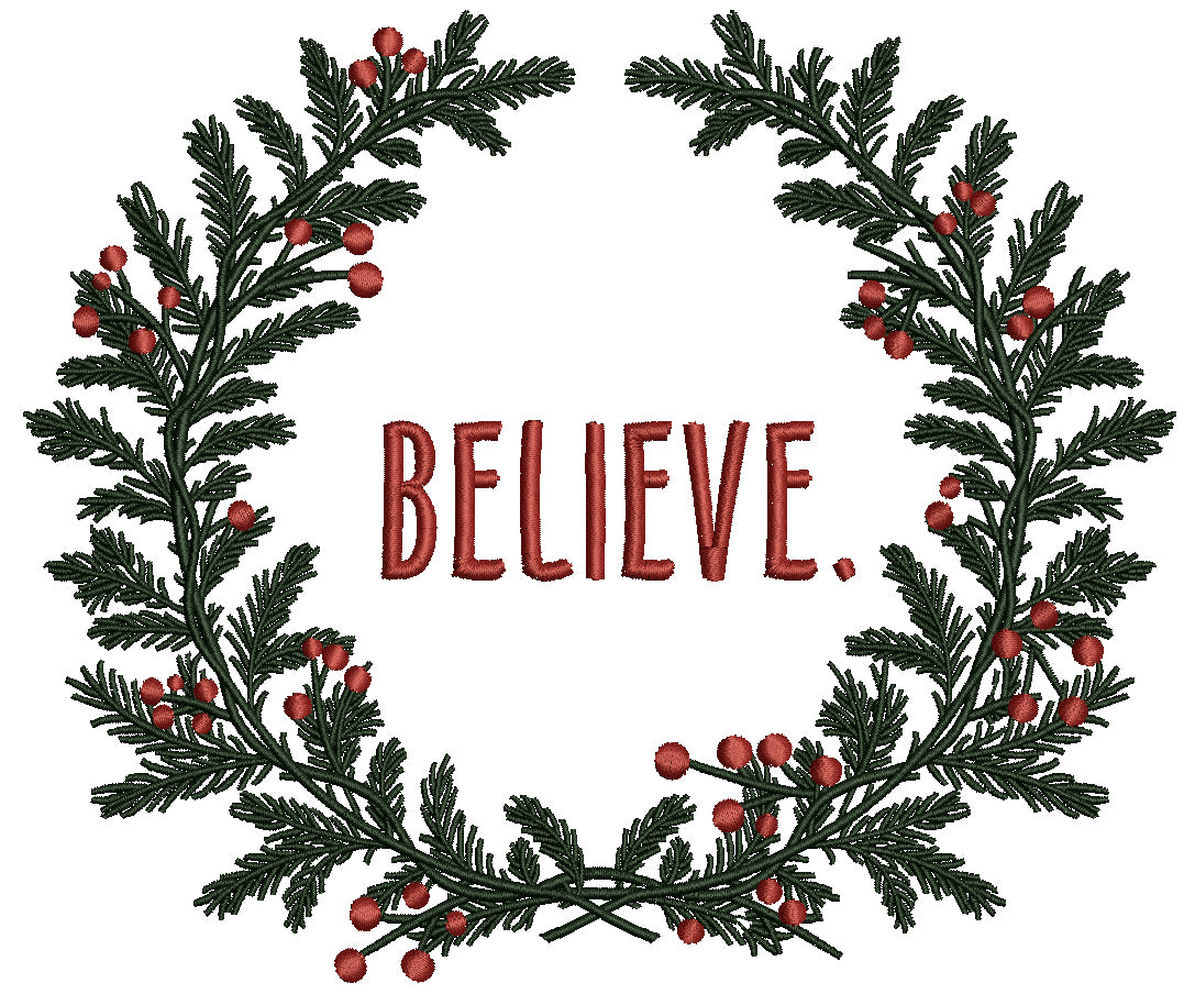 Believe Christmas Wreath With Winterberries Filled Machine Embroidery Design Digitized Pattern