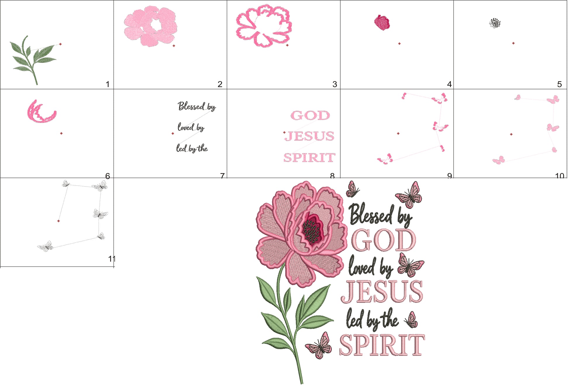 Blessed By Love Loved By Jesus Led By The Spirit Flower and Butterflies Religious Applique Machine Embroidery Design Digitized Pattern