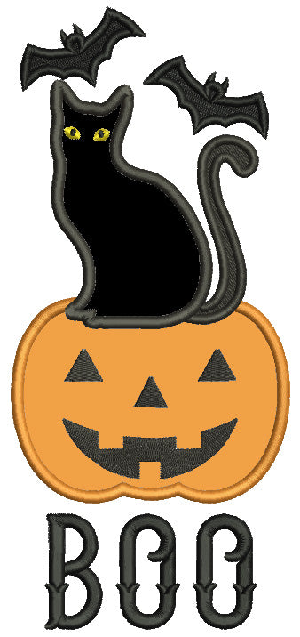 BOO Black Cat Is Sitting on a Pumpkin Halloween Applique Machine Embroidery Design Digitized Pattern