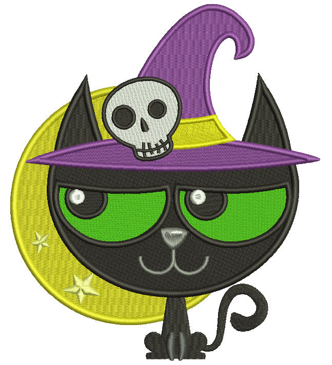 Cat on the Moon Wearing Witch's Hat Halloween Filled Machine Embroidery Digitized Design Pattern