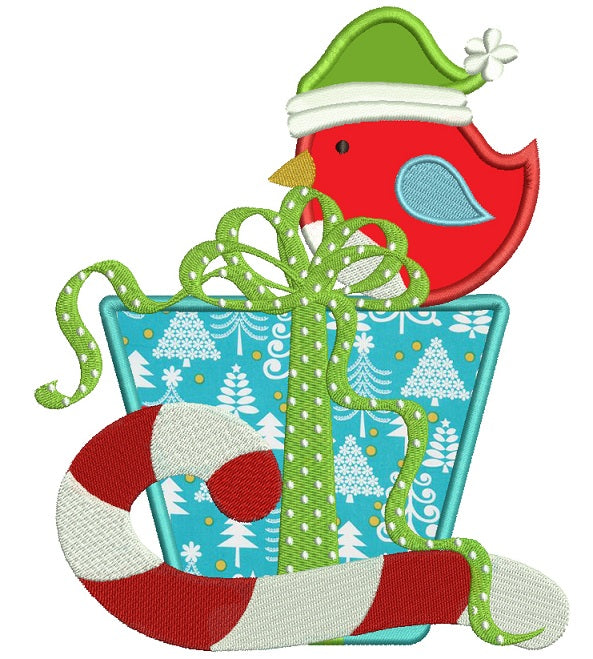 Christmas Bird Sitting on the a Box with Presents and Candy Cane Applique Machine Embroidery Design Digitized Pattern