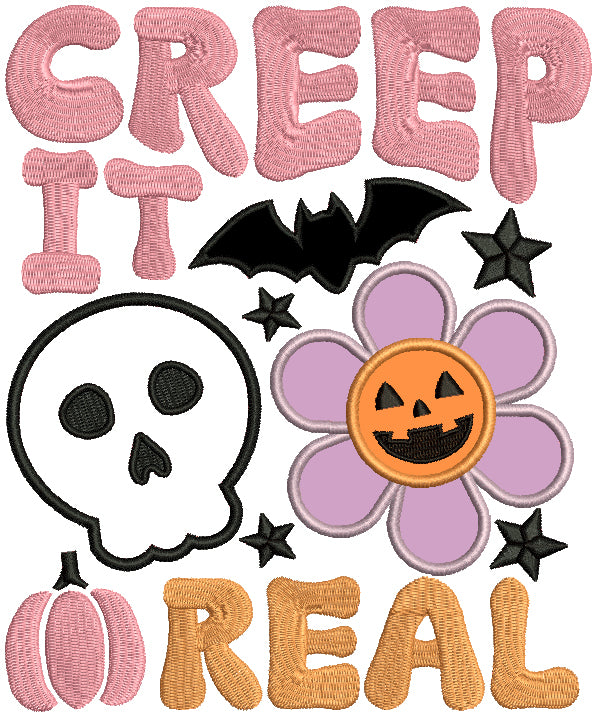 Creep It Real Skull And Flower Halloween Applique Machine Embroidery Design Digitized Pattern