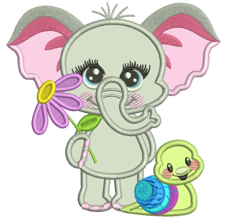 Cute Elephant With a Little Snail Applique Machine Embroidery Design Digitized Pattern - 11728