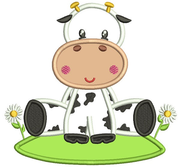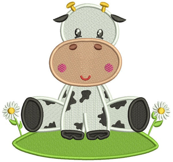 Cute Little Cow Sitting On The Grass With Flowers Filled Machine Embroidery Design Digitized Pattern - 10215