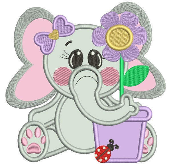 Cute Little Elephant With a Flower Pot Applique Machine Embroidery Design Digitized Pattern - 9056