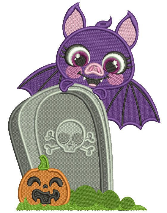 Cute Bat Behind a Headstone With a Pumpkin Halloween Filled Machine Embroidery Design Digitized Pattern
