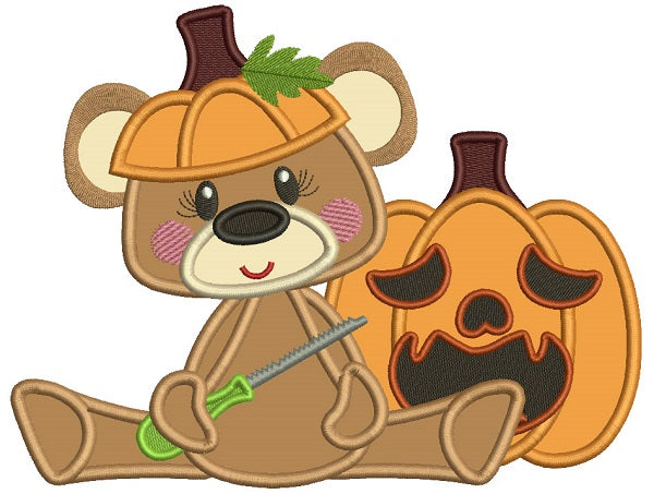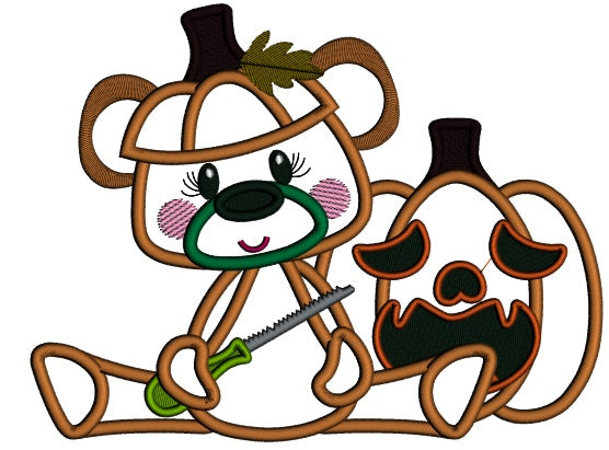 Cute Bear Carving Halloween Pumpkin Applique Machine Embroidery Design Digitized Pattern