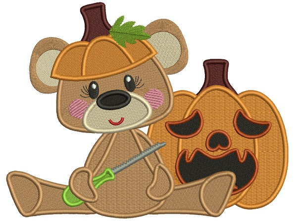 Cute Bear Carving Halloween Pumpkin Filled Machine Embroidery Design Digitized Pattern