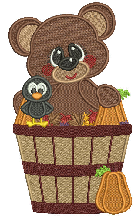 Cute Bear Sitting In a Fall Basket With Leaves Filled Machine Embroidery Design Digitized Pattern