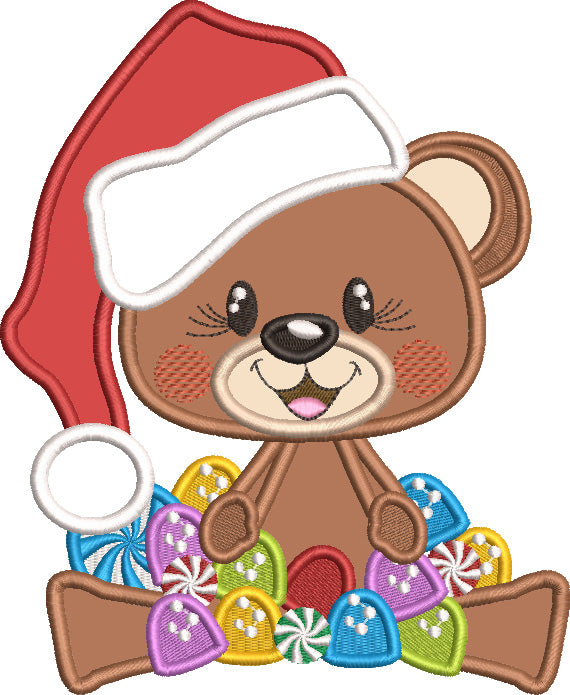Cute Bear Wearing Santa Hat With Candy Christmas Applique Machine Embroidery Design Digitized Pattern
