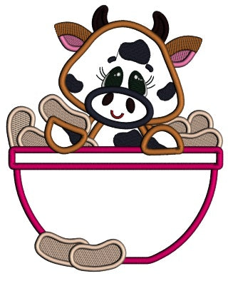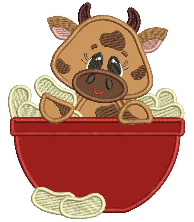Cute Cow Sitting Inside Cooking Bowl Applique Machine Embroidery Design Digitized Pattern