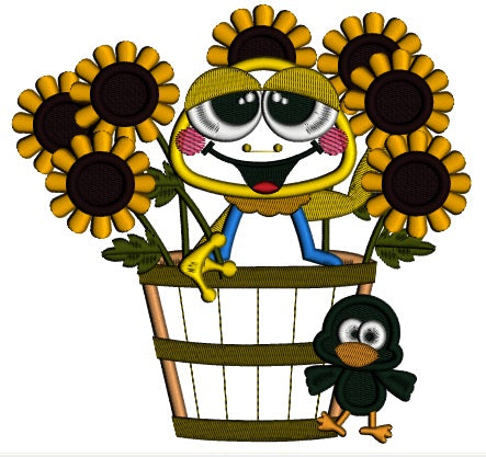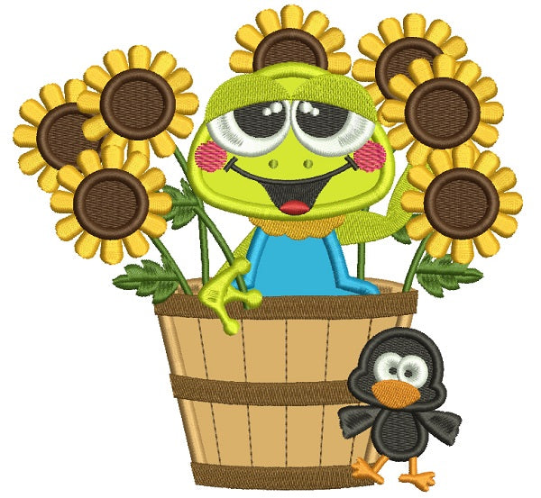 Cute Frog Sitting In The Pot With Sunflowers Fall Applique Machine Embroidery Design Digitized Pattern