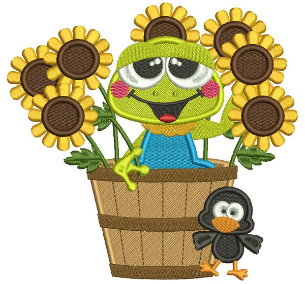 Cute Frog Sitting In The Pot With Sunflowers Fall Filled Machine Embroidery Design Digitized Pattern