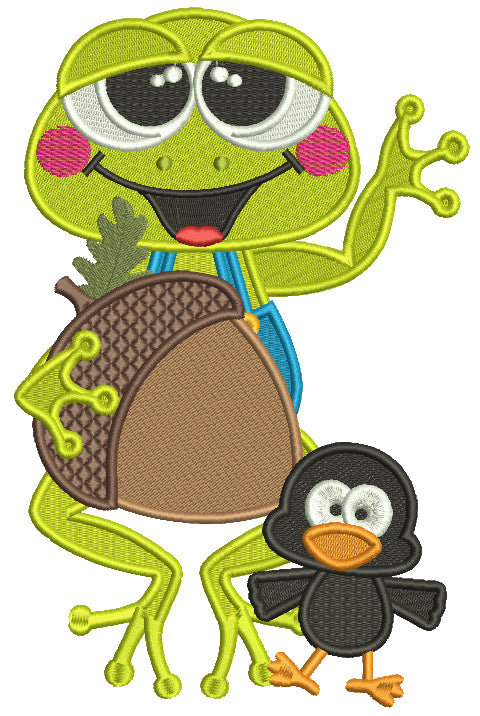Cute Frog With a Little Crow Holding Acorn Filled Machine Embroidery Design Digitized Pattern