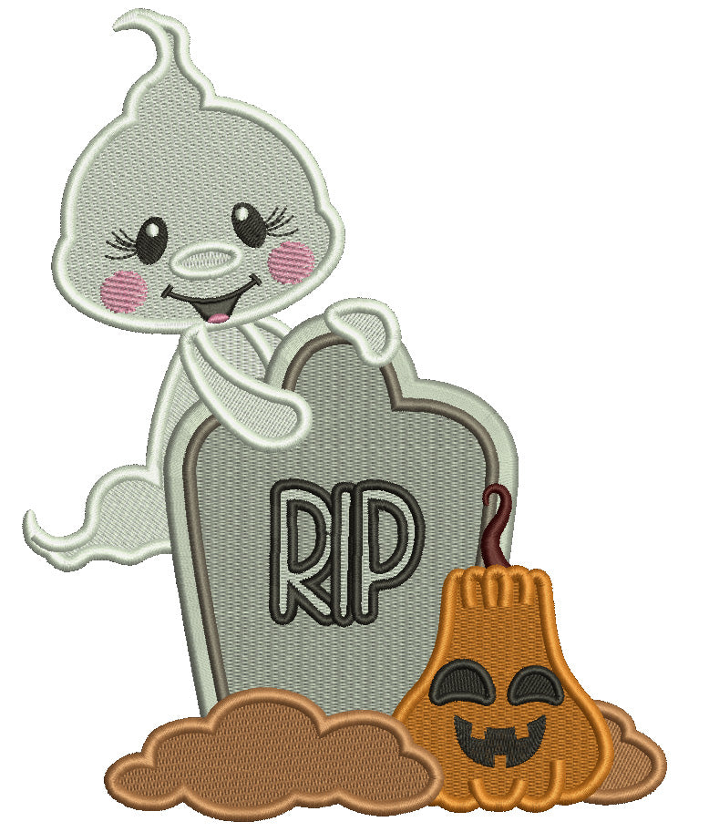 Cute Ghost Behind a RIP Headstone Halloween Filled Machine Embroidery Design Digitized Pattern