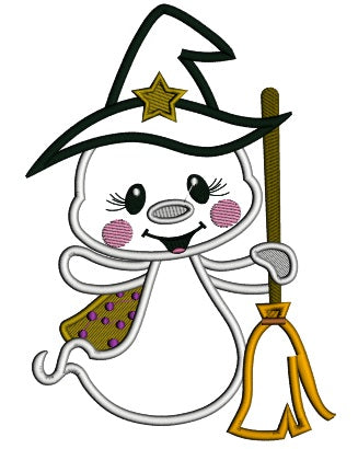 Cute Ghost Wizard Holding a Broom Applique Halloween Machine Embroidery Design Digitized Pattern