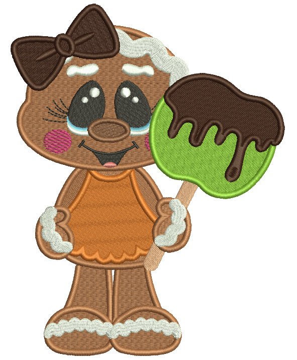 Cute Gingerbread Girl Holding Apple Covered With Chocolate Filled Thanksgiving Machine Embroidery Design Digitized Pattern