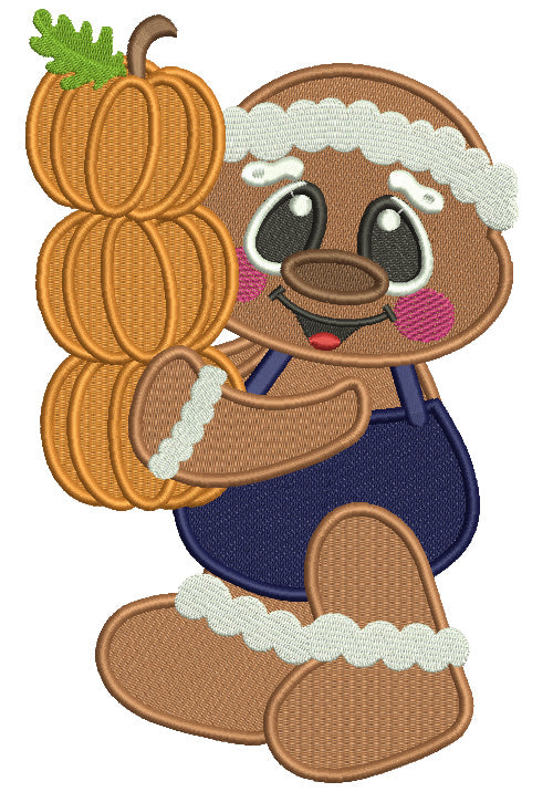 Cute Gingerbread Man Holding Three Pumpkins Thanksgiving Filled Machine Embroidery Design Digitized Pattern