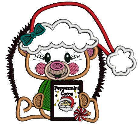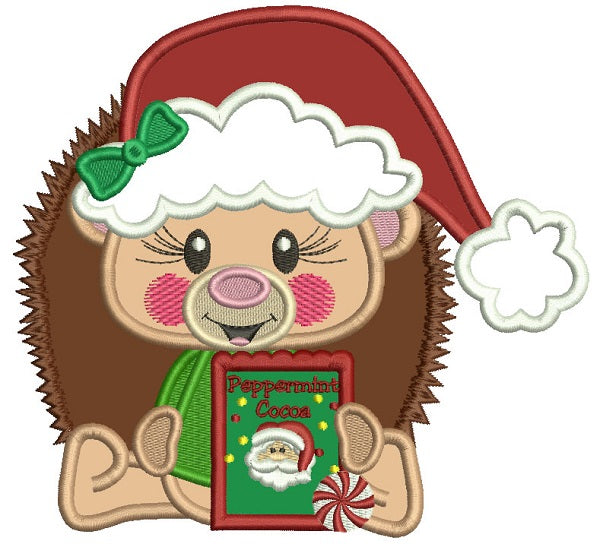 Cute Hedgehog Wearing Santa Hat Holding Peppermint Cocoa Box Applique Christmas Machine Embroidery Design Digitized Pattern