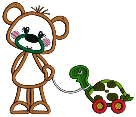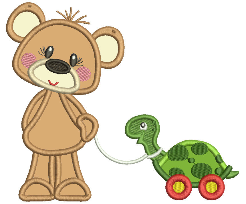 Cute Little Bear With Toy Turtle Applique Machine Embroidery Design Digitized Pattern