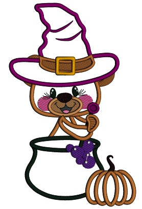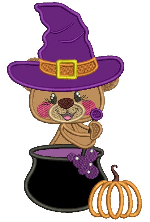 Cute Little Bear Wizard Sitting The Pot With Pumpkin Applique Halloween Machine Embroidery Design Digitized Pattern
