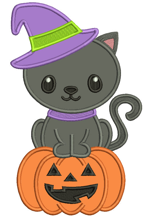 Cute Little Black Kitten Wearing Witch Hat Sitting On a Pumpkin Halloween Applique Machine Embroidery Design Digitized Pattern
