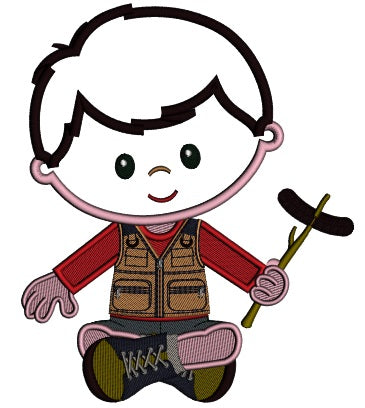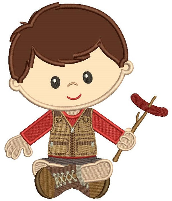 Cute Little Boy Camping Holding Sausage On The Stick Applique Machine Embroidery Design Digitized Pattern