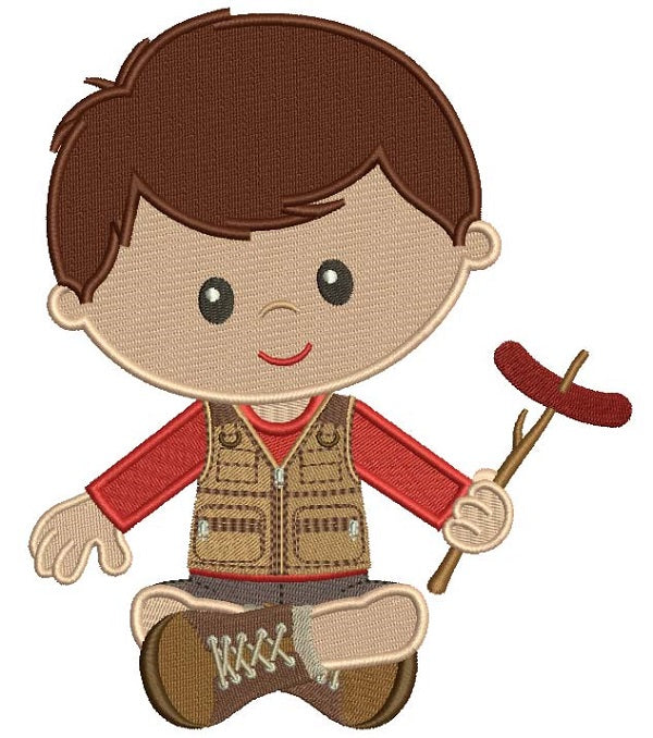 Cute Little Boy Camping Holding Sausage On The Stick Filled Machine Embroidery Design Digitized Pattern