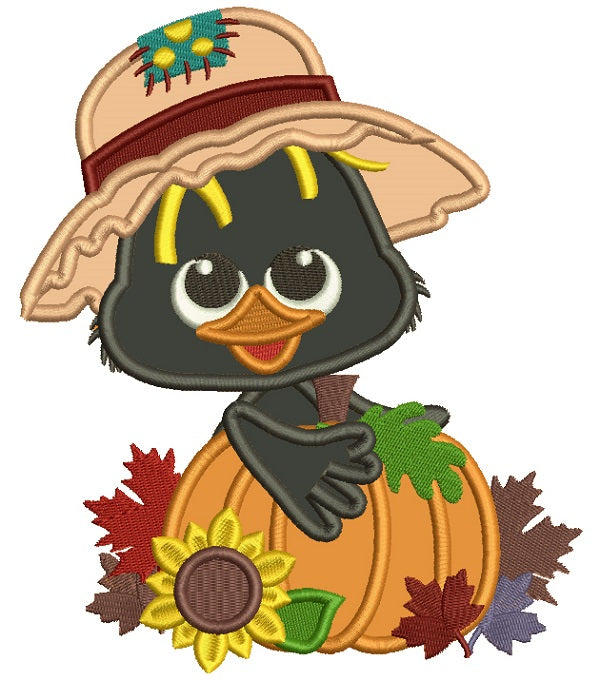 Cute Little Crow Holding Big Pumpkin Fall Thanksgiving Applique Machine Embroidery Design Digitized Pattern