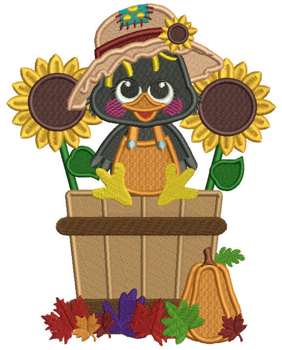 Cute Little Crow Sitting Inside Sitting Inside a Basket With Sunflowers Fall Filled Thanksgiving Machine Embroidery Design Digitized Pattern
