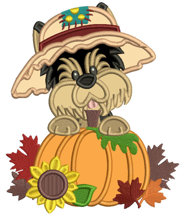 Cute Little Dog Wearing Hat Next To Pumpkin Fall Applique Thanksgiving Machine Embroidery Design Digitized Pattern