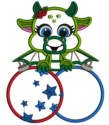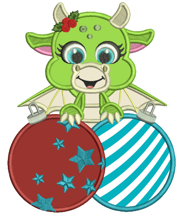 Cute Little Dragon Holding Christmas Ornaments Applique Machine Embroidery Design Digitized Pattern