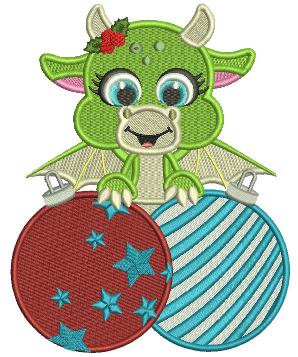 Cute Little Dragon Holding Christmas Ornaments Filled Machine Embroidery Design Digitized Pattern