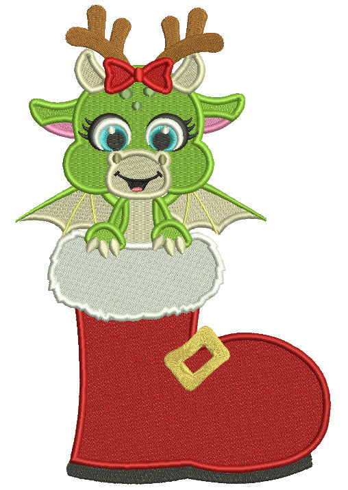 Cute Little Dragon Sitting Inside Santa Shoe Filled Christmas Machine Embroidery Design Digitized Pattern