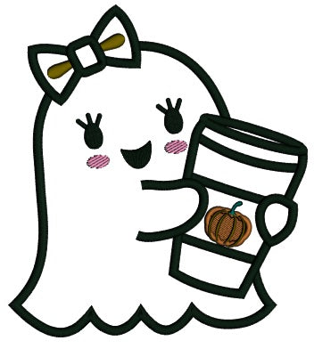 Cute Little Ghost Holding a Drink Halloween Applique Machine Embroidery Design Digitized Pattern