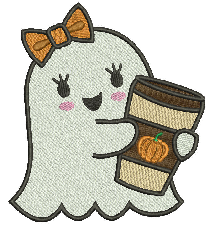 Cute Little Ghost Holding a Drink Halloween Filled Machine Embroidery Design Digitized Pattern