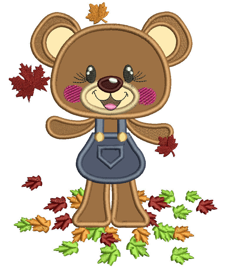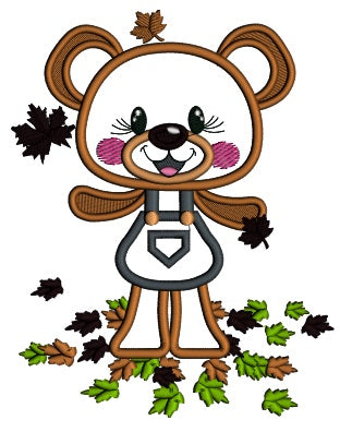 Cute Little Girl Bear Catching Leaves Fall Applique Machine Embroidery Design Digitized Pattern
