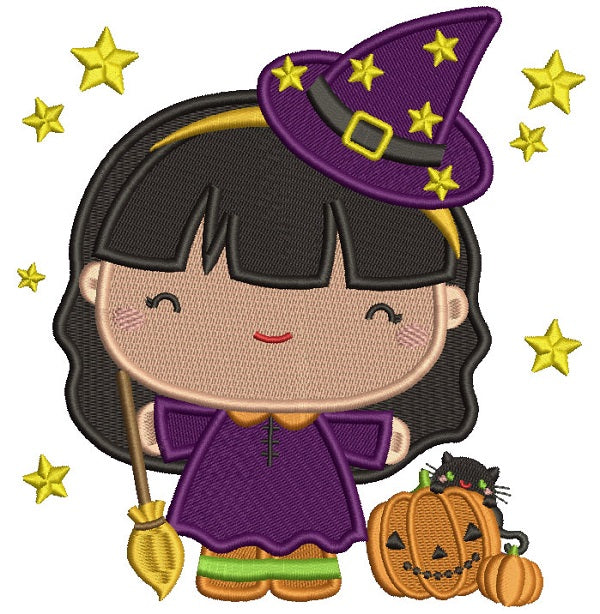 Cute Little Girl Witch Halloween Filled Machine Embroidery Design Digitized Pattern