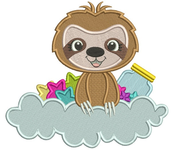 Cute Little Sloth sitting In The Cloud With Stars and a Jar Filled Machine Embroidery Design Digitized Pattern
