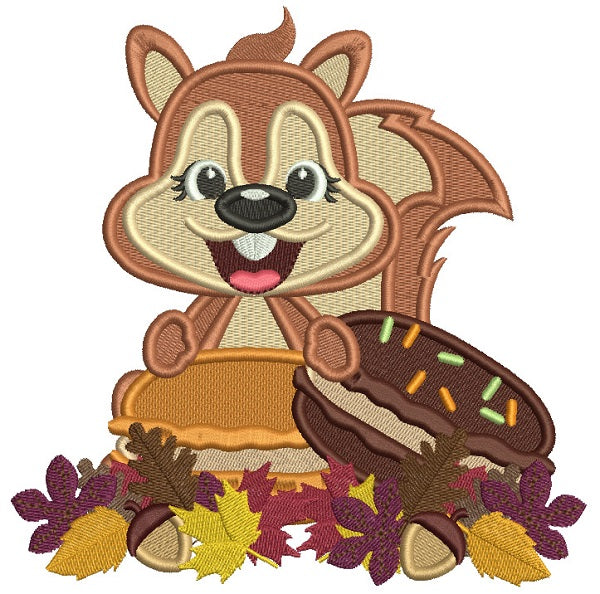 Cute Little Squirrel Eating Donuts Fall Filled Machine Embroidery Design Digitized Pattern