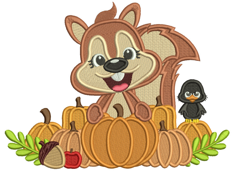Cute Little Squirrel With a Bird Acorns and Pumpkins Fall Filled Machine Embroidery Design Digitized Pattern