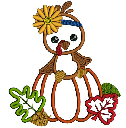 Cute Little Turkey Sitting On The Pumpkin Thanksgiving Applique Machine Embroidery Design Digitized Pattern