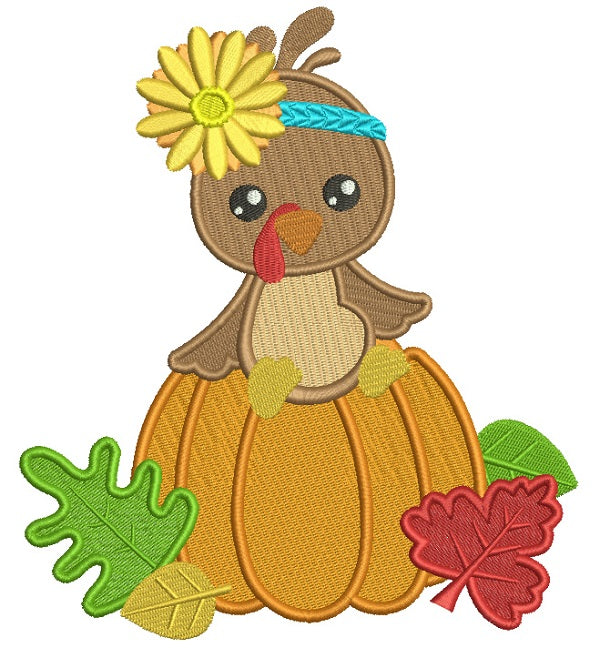 Cute Little Turkey Sitting On The Pumpkin Thanksgiving Filled Machine Embroidery Design Digitized Pattern