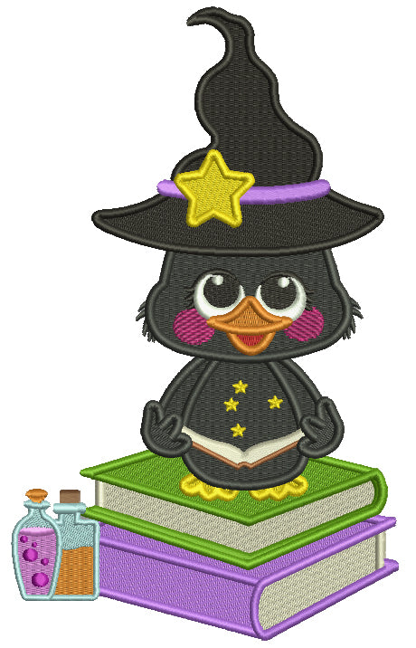Cute Little Wizard Crow SItting On Potion Books Filled Halloween Machine Embroidery Design Digitized Pattern