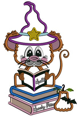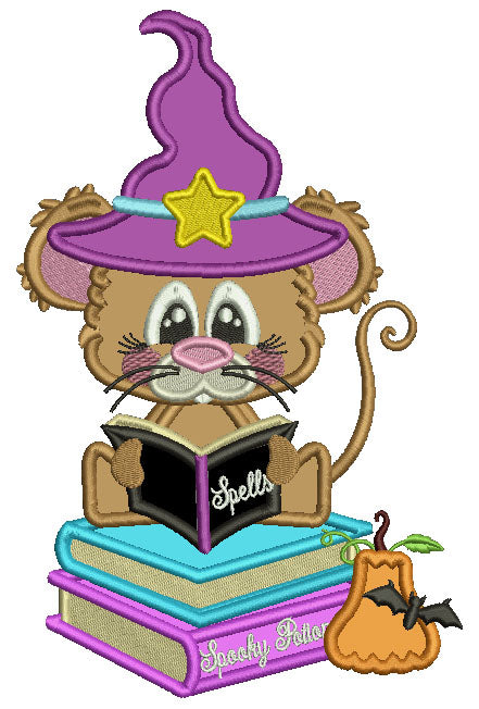 Cute Little Wizard Rat Reading The Book Of Spells Halloween Applique Machine Embroidery Design Digitized Pattern