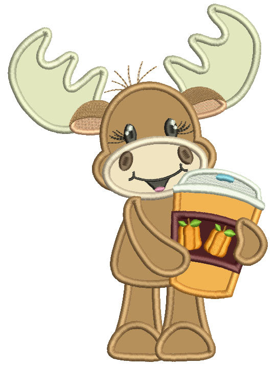Cute Moose Holding Coffee Cup With Pumpkins Fall Applique Thanksgiving Machine Embroidery Design Digitized Pattern